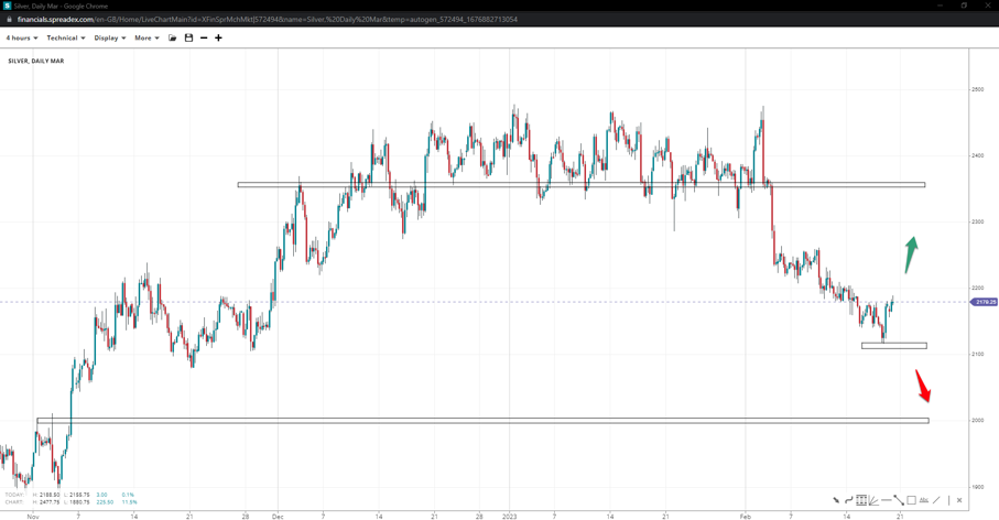 Silver extended losses as it appears in a bearish impulse, pending further declines towards 20.00 unless it hovers above 21.00. A potential bounce could see bears fail for an upward spiral towards 23.50, but it requires regaining control of the short-term resistance at 22.30