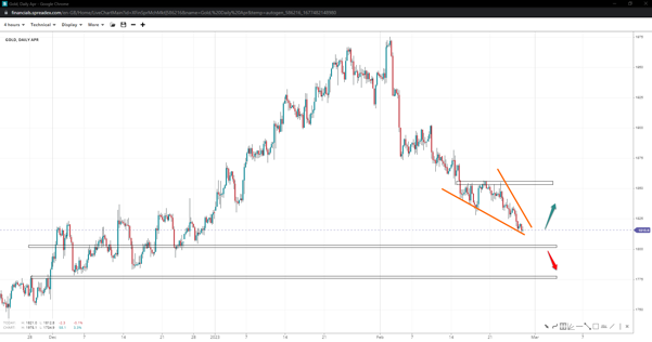 The US TECH index has either completed or is near completing a wedge pattern, increasing the chances of a pullback to 12250 or a dip towards 12405. Losing the swing low of 11895 might clear the path to 11540, but it is unlikely to close the week below there.