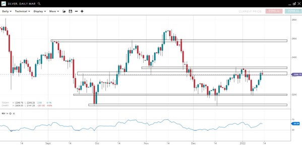 The price is testing a confluence of resistance at 23.20/50 after having rebounded from 22. A move over 23.50 implies a test of the top of the range near 25.