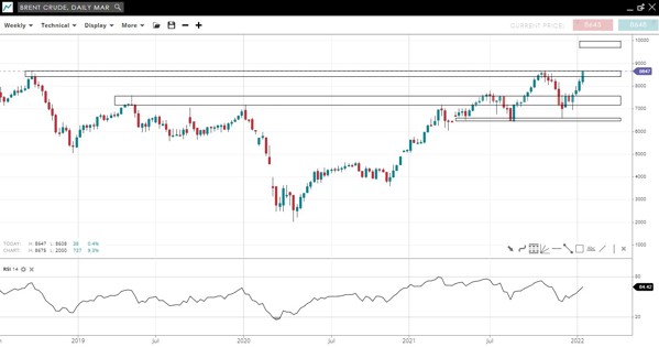 From this weekly chart, it can be seen that Brent is back near its 2018 peak for a second time. The uptrend indicates a breakout with 100 next major resistance.