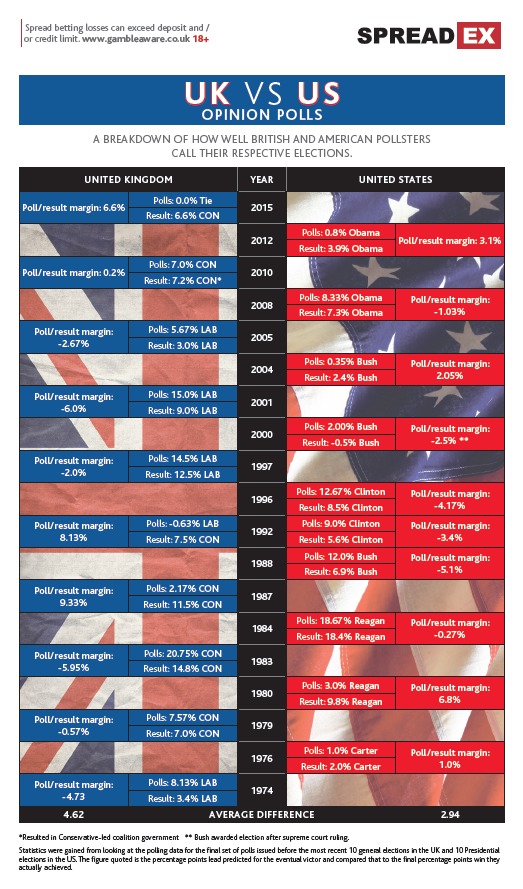 The study, conducted by spread betting company Spreadex, looked at the past ten US presidential and UK general elections with results showing a clear difference between the accuracy of pollsters on either side of the Atlantic. The study found that: