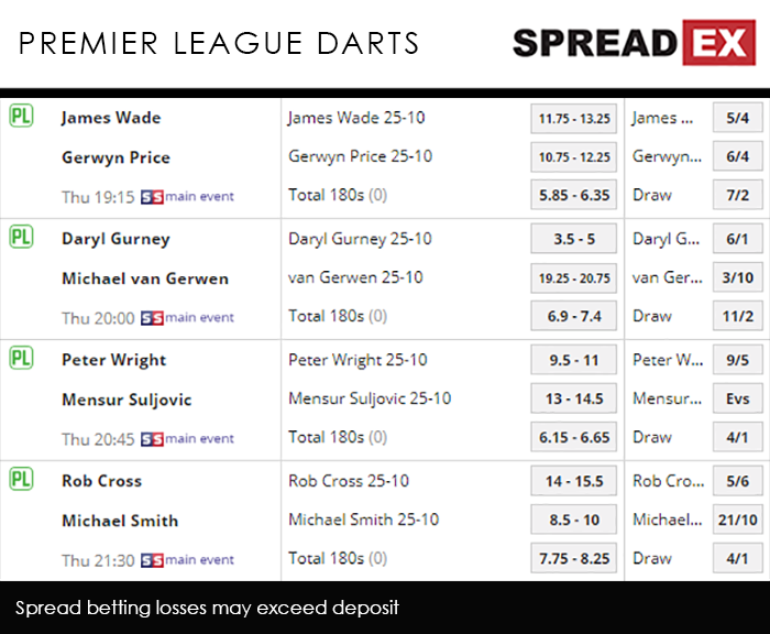 That leaves Mighty Mike in 1st place on 19 points, and at a Spreadex Outright Index spread of 49-52, with Cross just one point behind on 18, but way off his Dutch rival at a spread of 34-37. Rounding out the top 4, Price and Wade, on 15 points apiece, are then at Outright Index spreads of 19-22 and 20-23 respectively. Things begin at 7.15pm, with what is perhaps the hardest match to call of the entire evening: James Wade vs Gerwyn Price. The Englishman is just about favoured to open up a gap between him and the Welshman, with Spreadex offering a Wade/Price 10-3 Supremacy spread of -0.5-2.5. van Gerwen then takes on Daryl Gurney at 8pm. The Dutchman is expected to breeze past his opponent, at a van Gerwen/Gurney 10-3 Supremacy spread of 13-16. Sat plumb at the bottom of the table, Peter Wright, who is yet to win a fixture in Phase 2, faces Mensur Suljovic at 8.45pm. It looks unlikely that the Scot will end his lousy form, with Spreadex offering a Suljovic/Wright 10-3 Supremacy spread of 2-5. Week 13 culminates with Rob Cross taking on Michael Smith at 9.30pm. If van Gerwen somehow stumbles earlier in the night, then the top spot could be there for Cross to take; fortunately he should be Smith, at a 10-3 Supremacy spread of 4-7.