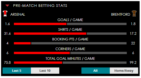 To see all the Arsenal v Brentford betting stats and form, visit our pricing page to view our Pre-Match betting stats table or hover over/tap the chart image to see previous outcomes for that particular market.