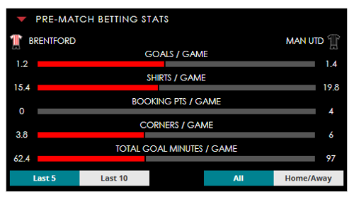 To see all the Brentford v Man Utd betting stats and form, visit our pricing page to view our Pre-Match betting stats table or hover over/tap the chart image to see previous outcomes for that particular market.