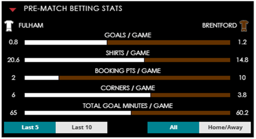 To see all the Fulham v Brentford betting stats and form, visit our pricing page to view our Pre-Match betting stats table or hover over/tap the chart image to see previous outcomes for that particular market.