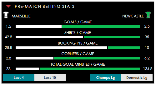 To see all the Marseille v Newcastle betting stats and form, visit our pricing page to view our Pre-Match betting stats table or hover over/tap the chart image to see previous outcomes for that particular market.